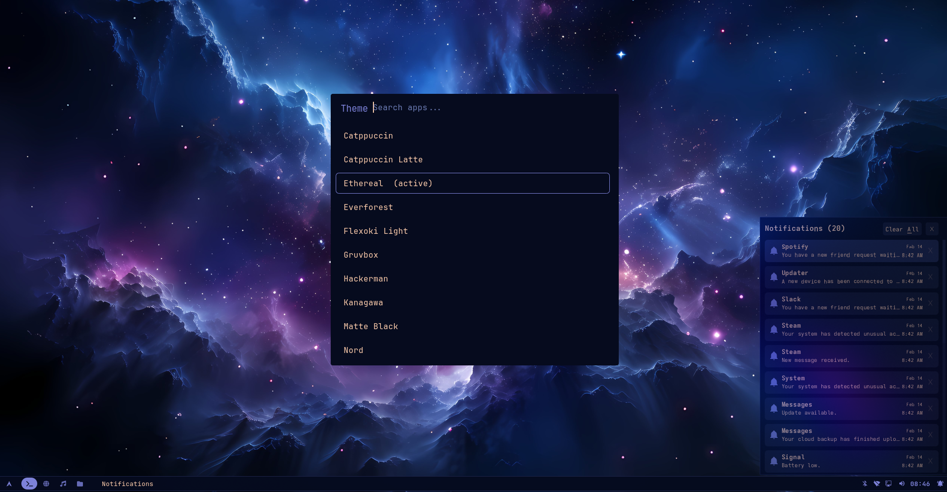 You can spin up sandboxed web apps on the fly — any website becomes an isolated app with its own window, its own profile, and no access to your main browser data. A 14-theme system recolors every app on the desktop with one command. Offline-first installation — no internet, under 2 minutes. Cross-compositor — same configs, themes, and keybindings across Hyprland and DWM.